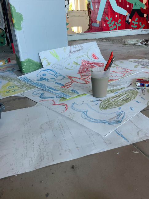 "What Remains to Play" is a mural in the Red Zone Gallery, made from representations of drawings made by Palestinian children in Gaza.