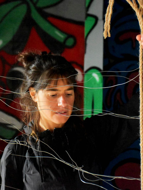 Sent by teachers and organizations that create spaces of play and imagination among the rubble. Around the column with drawings, there's a wire structure that oppresses and encloses a swing.